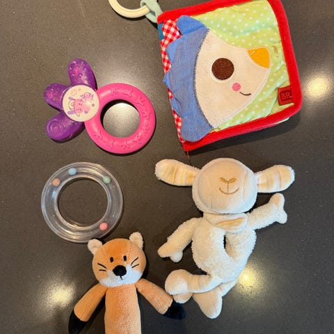 Fina Leksaker och en gin bok med mycket bilder för en Ett åring