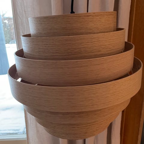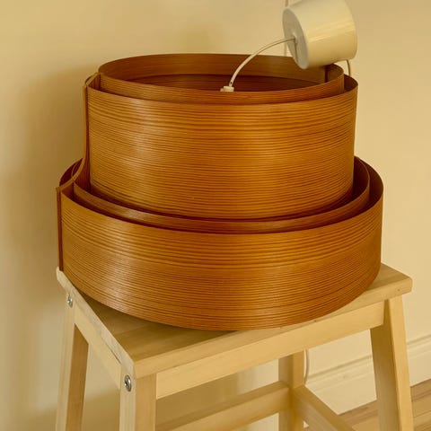 Två vackra vägglampor, modell V327, designade av Hans-Agne Jakobsson för Elyssett i Markaryd. Lamporna är tillverkade i furufaner med väggfästen i massivt trä, och har den tidstypiska skandinaviska design som gjort Jakobsson så eftertraktad. Det tunna faneret släpper igenom ljuset och skapar ett varmt, mjukt sken som ger rummet en trivsam atmosfär.
