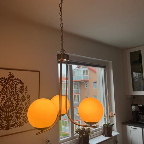 En vacker taklampa som kombinerar träets värme med glasets mjuka ljus. Den ger ett lugnt och trivsamt intryck i rummet – perfekt över matbordet eller i vardagsrummet.