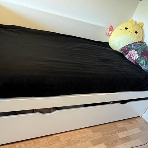 Liten spricka i plankan som lyfts upp för förvaringen men inte rakt igenom och påverkar inte funktionen alls då det är stålram.