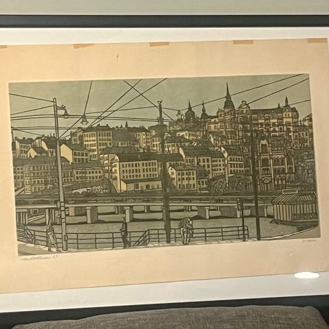 Litografi EA - Rolf Säfvenberg . Hjo Hamn