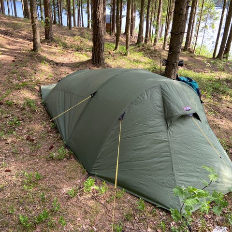 SilPoly-väven suger knappt upp vatten, håller formen även i regn och är idealisk för nordiskt klimat. Dubbel T-zip-öppning, två absider, mycket utrymme för två personer eller lyxigt solo.