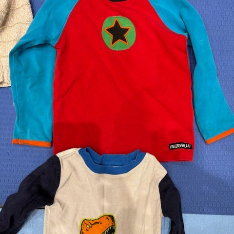 Två st Collegetröjor i stl 122. Fotavtrycken på den blå/turkosa tröjan är självlysande. Tröjan är väldigt rejäl och stark i materialet. Dock har den två mindre skönhetsfläckar (se bild). Att trycket ser lite krakelerat ut på Mussetröjan är enligt design. Det är inte för att tröjan är sliten (vilket den alltså inte är).
