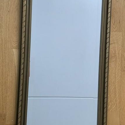 Stor spegel rokokostil med utsmyckningar - med förgylld träram. Ålder- 1900 tal. Spegeln är ca 112 cm hög och 58 cm bred. Den säljs i befintligt skick (som på bilder)