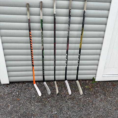 10 st hockeyklubbor, obs höger, varav tre helt oanvända. Flex 80 till 87. Säljes bara som "paket".