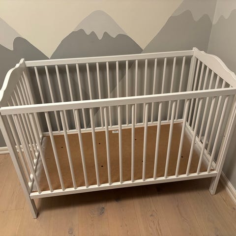 En spjälsäng från Woodies (väldigt upskattat av oss!), en madrass, två passande nytvättade madrasskydd (dra-på-lakan), en ny barnfilt och en ny snuttefilt. Sängen användes av ett barn och är i ett mycket fint skick! Just nu kostar endast sängen 3599 SEK på Jollyroom (dock annat färg).