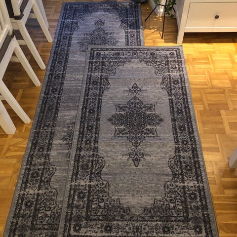 Tre runda mattor i gråa och vita toner, lätt melerad. Endast använda en kort period och är i fint skick i övrigt, inga fläckar.