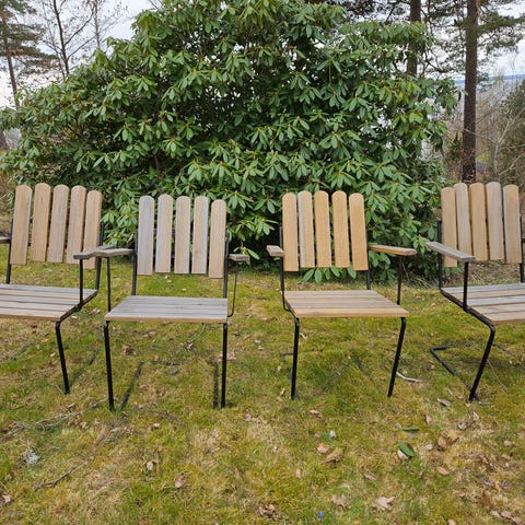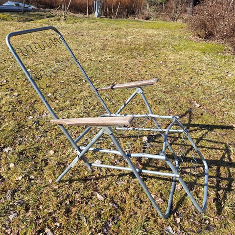 Rejäla ihopfällbara stolar, gedigna och stadiga. Stålrör med grön lack är bra. Träet är friskt, men behöver kanske lackas, beroende på vilken preferens man har. Den sista bilden visar att en plastdetalj saknas på båda stolarna på båda sidorna. Stolarna funkar som de är, men för säkerhets skull hade jag reparerat detta. En enkel sak för en händig person. Prutat och klart! Hämtas på plats. Kontant eller Swish.