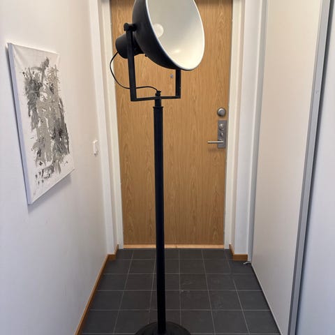 Säljer en snygg och ovanlig golvlampa med industriell design. Lampan står på ett stabilt trebensstativ och har en lampskärm som liknar en gammal fläkt med flera ljuskällor runtom. Ger ett varmt och behagligt sken, perfekt som stämningsbelysning i vardagsrum, sovrum eller kontor.