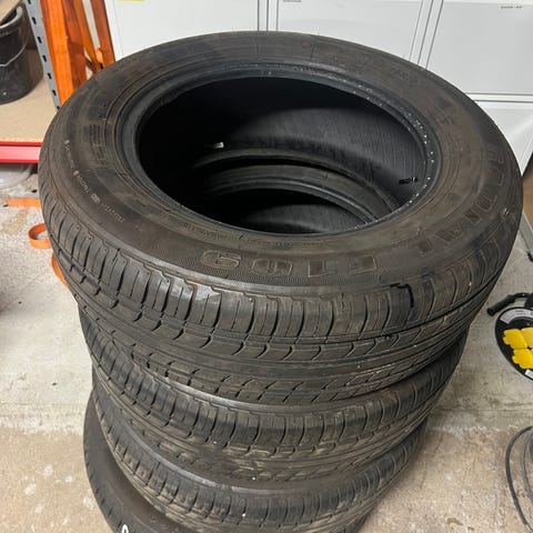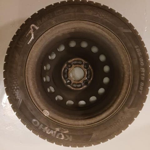 Volvo 15 tum dubbdäck på svart plåtfälg. Däcken är 3-5 mm och kanske inte så mycket att ha, men original plåtfälgarna är fina. Volvo nr 1387534 på dessa. Tror att de är från 740/940. Bild 6-9. SÅLDA