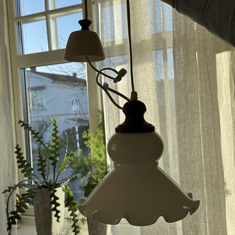Taklampa i svart, glaskupa. Som ger fint ljus. Lampan är hel i övrigt, men sladden är synligt skadad (se bild). Perfekt för den som vill laga eller använda lampan på annat sätt.