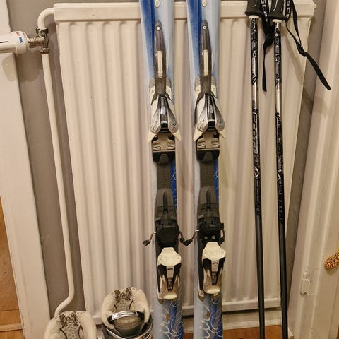 Hjälm, pjäxor och skidor