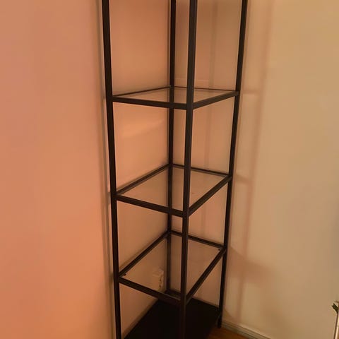 Vintage IKEA Knubbe Hylla i stål och svart glas. 3 hyllplan. Legat i sin originalförpackning (se bild) och därför är skicket som nytt. Se bilder för mått.