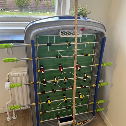 Stabilt bordfotbollsspel i svart med ben i fullstorlek. Har markeringsräknare på sidorna och klassisk spelplan med spelare i två lag.
