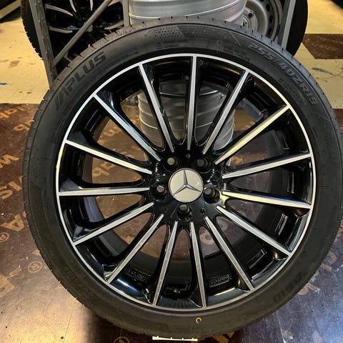 Mercedes-Benz däck med fälgar. Lättmetallfälgar i silver, storlek 18 tum. Däck monterade på fälgarna. Passar personbil med Mercedes-Benz-bultmönster. Exakta dimensioner, däckstorlek och mönsterdjup behöver kontrolleras på plats eller mot märkning på däcken.