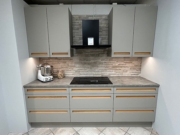 Nu säljer vi vårt utställningskök från JKE med luckan Silk greige och Woodland i rökt ek.