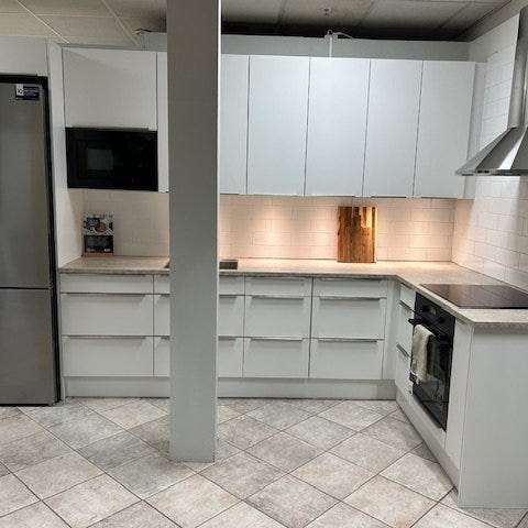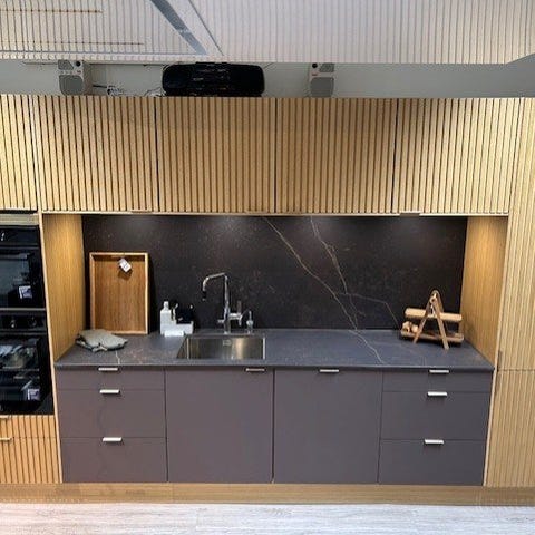 Nu säljer vi vårt utställningskök från JKE med luckan Vintage i varm grå.