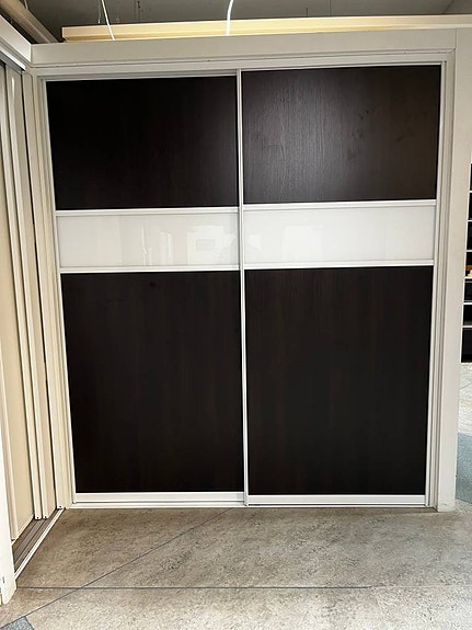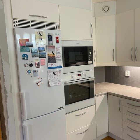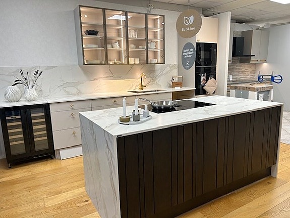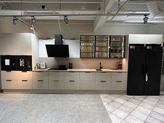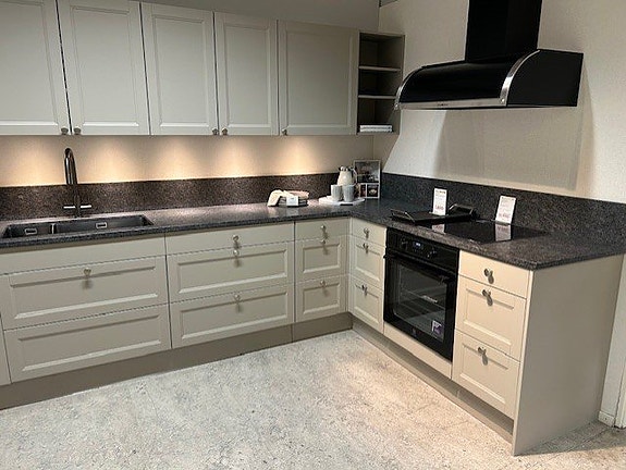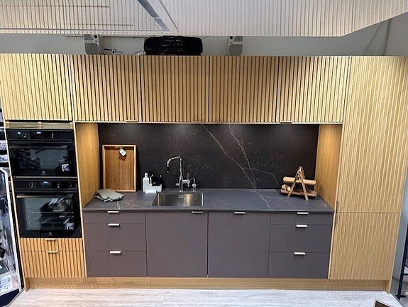 Nu säljer vi vårt utställningskök från JKE i luckan linoleum sand med ek kant.