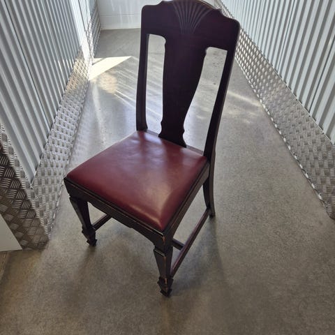 En klassisk stol med brun läderklädsel på sits och ryggstöd. Stommen är tillverkad av trä och dekorerad med nitar längs ryggstödets kant. Stolen har en tidlös design som passar i många olika inredningsstilar.