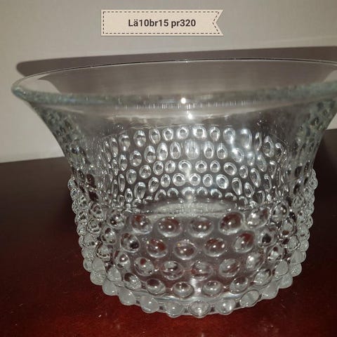 Skålen på bilden är en "Nyppylä"-skål, även känd som "Krokus", designad av Saara Hopea för Nuutajärvi Glasbruk.