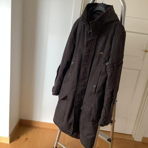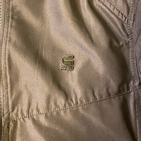 G-star täckjacka i svart med luva. Luvan går att ta bort. Trasig upphängshållare i över bra skick