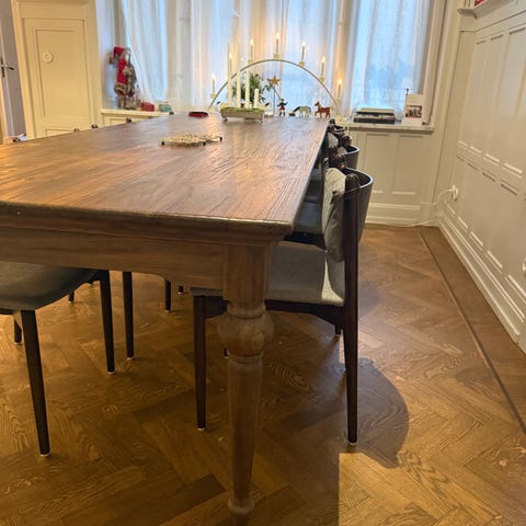 Matbord tillverkat i mörkt trä med robust konstruktion. Bordet har en rektangulär form och är anpassat för flera sittplatser. Passar för matsal eller kök.