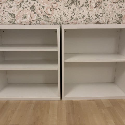 Intressekoll för en vit fin hylla från Ellos, 54 × 59 × 16. Stommen i metall och hyllplan i trä. Flyttbara hyllplan.