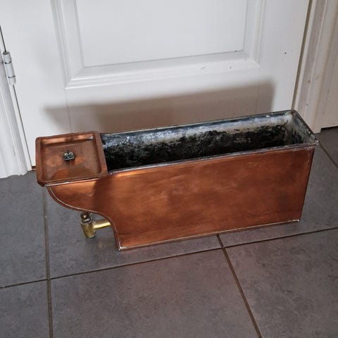 Jag har låtit göra lådan av en Plåtslagare i svart metall . Mycket dekorativ . Måtten 64x27 x 20 . Lödningen har lossnat lite i ett hörn . Behöver inte lagas , jag har haft den , som den är nu . Lådan ger karaktär .Till SOMMARENS alla blomkrukor , blir vackra i denna svarta plåtlåda , det får plats många , det blir en blomsterprakt . + att den ger vinterns gran/ tallris en vacker inramning o med en belysningsslinga .