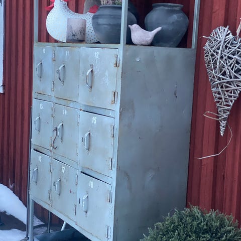 Stabil konstruktion i metall, båda dörrarna med lås (nycklar finns).