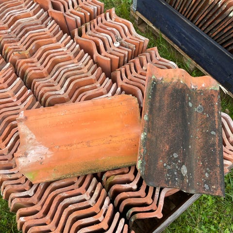 Gamla enkupiga takpannor i tegel säljes. Troligtvis 1920-tal. Har tidigare suttit på taket till en byggnad som byggdes 1929 och renoverades på 1990-talet. 90-talets takbyte beräknas vara det enda så dessa pannor bör vara från 1920-talet. Har varit förvarade i en ouppvärmd, men i övrigt torr bod. Nu staplade om 10st per hög. Pannorna är alltså i använt skick. De största skavankerna har sorterats bort vid utlastning. Ingen stämpel förutom handavtryck (se bild), men ett par stycken har hittats separat med stämpeln ”O.R. HEBY” (= Olsson och Rosenlunds Tegelbruk). Mått: ca 28cm x 40cm. Ca 550 stycken finnes. 5 kr pannan eller 2500 kr för hela partiet. Hämtas av köparen. Köper du hela partiet tar du med allt. Vid frågor eller om du önskar fler bilder; kontakta mig så försöker jag svara så gott jag kan.