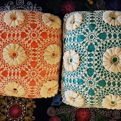 Kudden är troligen från Mellanöstern eller Centralasien (Turkiet/Iran/Afghanistan), och har ett starkt etnografiskt uttryck med symboliska motiv som stjärnor, korsformer och zigzaglinjer.
