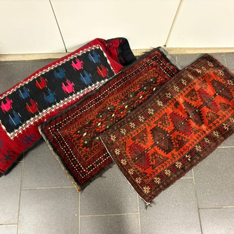 Säljer en vacker och gedigen vintage kilimkudde med traditionellt geometriskt mönster i jordnära färger – brun, röd, blå, grön, svart och vit.
