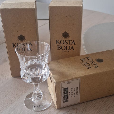 Vinglas (finns 20 st), höjd 11 cm, bredd 7.5 cm. Pris: 190 kr/st