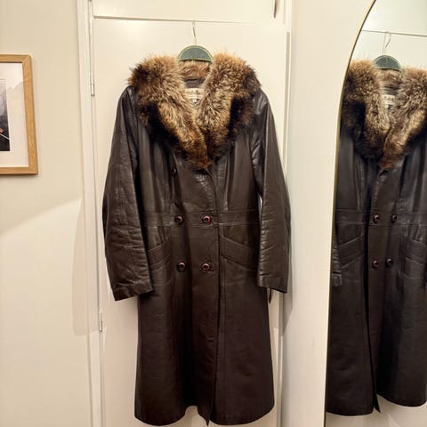Snygg svart skinnrock i klassisk modell. Några mindre ytliga fläckar (se bild), men i övrigt fint skick. Mycket snygg passform och bra kvalitet.