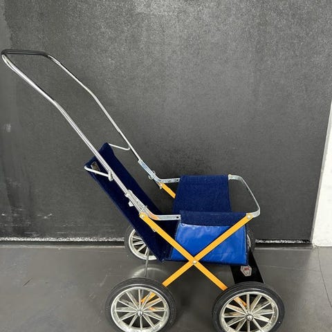 En charmig vintage dockvagn med blå sits och rött underrede. Perfekt för samlare eller barn som älskar att leka med dockor. Är från 60- 70-talet, skavanker, lite rost finns.