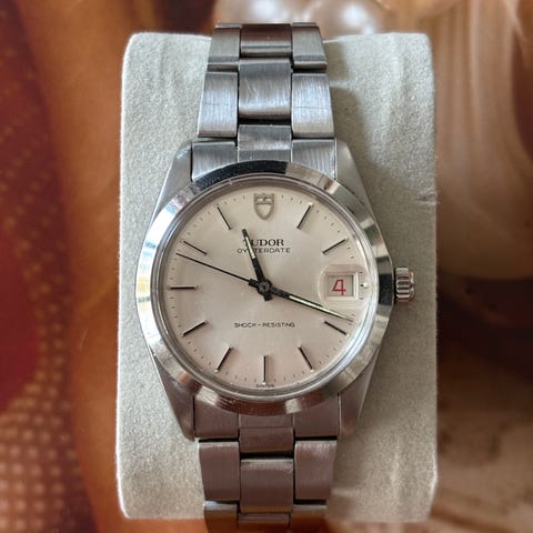 36.5 x 43 mm stainless steel case with fluted bezel and compressor back, original acrylic crystal. Perfect champagne sunburst metallic dial with silver hands and indices (Logo at top rotates with a light tap). Original beads of rice bracelet included (18+cm, extra links available)
