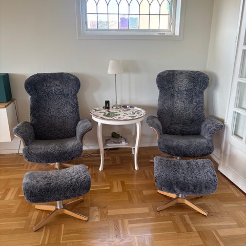 Säljer ett par specialtillverkade snurrfåtöljer i läder och matchande fotpallar.