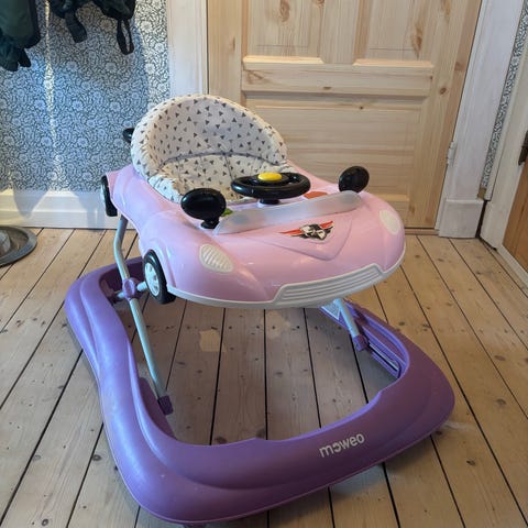 En rolig Moweo baby walker i form av en bil. Perfekt för barnet att öva på att gå och utforska omgivningen. Fullt fungerande, har en ratt med tuta, olika låtar när man klickar på blinkers, ljud och belysning på pilarna, inga anmärkningar! Har knappt använts, som i ny skick!