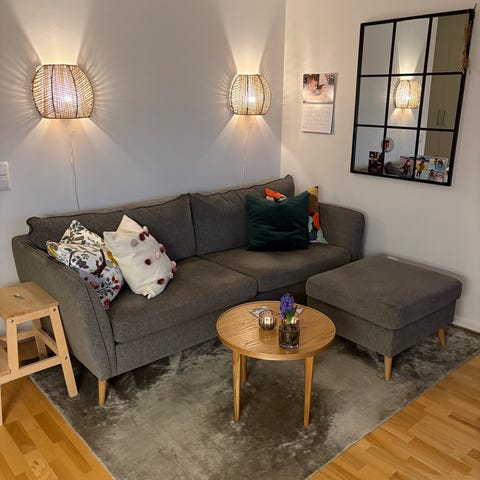 Soffa 1 år gammal. Endast schäslongen används. Delen med schäslong är flyttbar, flyttas enkelt. Nackkudde ingår. Rundade ben av ek. Färgen stämmer inte på de ljusare bilderna. Inköpspris ca 12000, kvitto finns.