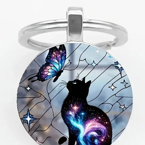 Nyckelring glödandekatt. 3,5 × 2,8 cm. Glasöverdrag rund.
