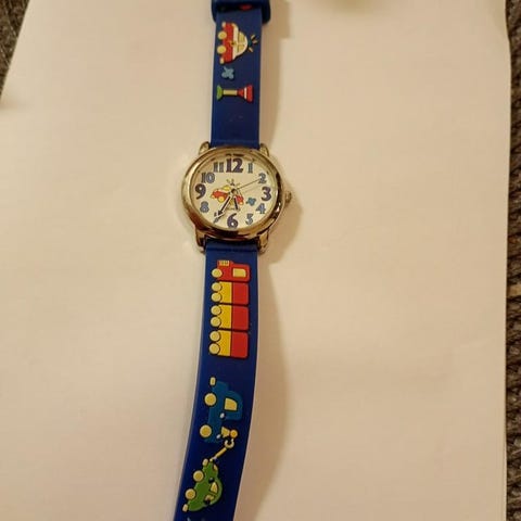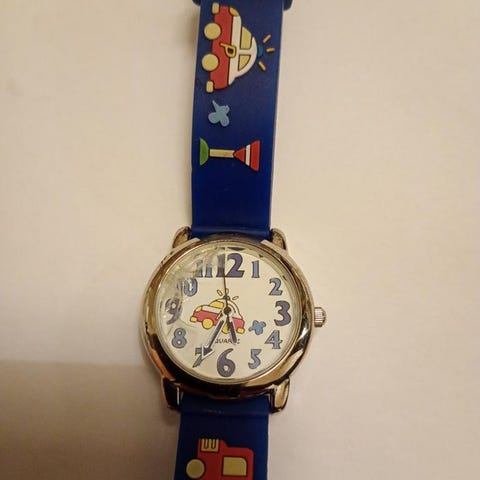 Klocka för barn med kardborrband med fotbollstema. Tyvärr är batteriet slut. De får man byta själv.