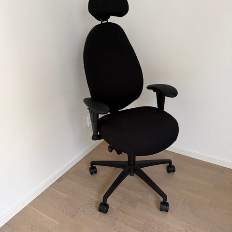 Ergositter arbetsstol med den unika delade sittdynan. Dynan är delad för att kunna avlasta trycket på ryggen när man sitter. Idag heter den Ergositter X3. Minns ej modelnamnet på denna men det är motsvarande modell fast äldre. Sök på Ergositter så finner ni all information hos tillverkaren. Denna är dock en äldre modell som är mer än 5år men i mycket bra bruks skick. Enda felet är en bit som lossnat på armstödet men har limmat tillbaka den. Ska fråga tillverkaren om man kan köpa ny del då överdelen är skruvad på armstödet så man. Alternativt klä armstöden. Stolen är helt unik med sin funktion och har man problem med ryggen vid stilla sittande är denna stol helt fantastiskt. Man avlastar trycket på själva ryggraden då man lägger mer tryck på låren istället. Motsvarande stol kostar idag 30.000:- inkl moms, denna stol ser nästan likadan ut som dagens modell.