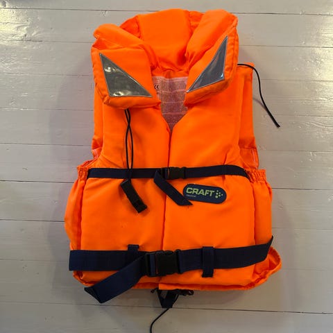 Flytväst 15-20kg. Nypris liknande runt 400kr. Litet hål i tyget på ryggen som sannolikt inte påverkar funktionen.