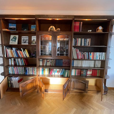 Bokhylla i valnöt med vitrinskåp