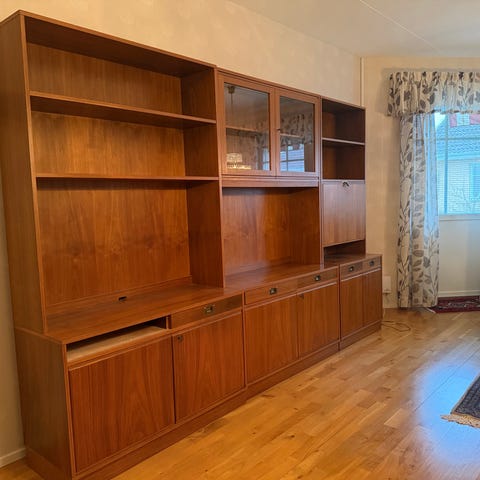 Bokhylla i valnöt med vitrinskåp som har hyllplan i glas. Belysning finns också i bokhyllan.