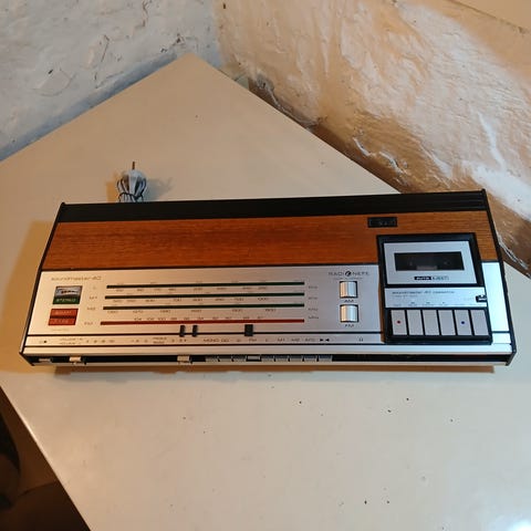 Får inte igång bandspelaren, men radion. Går kanske att laga eller att ta reservdelar av. I övrigt i fint skick.