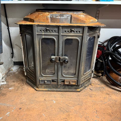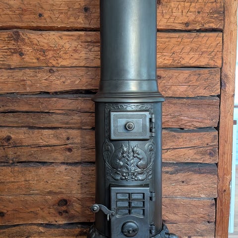 En gjutjärnskamin, röret som hör till medföljer.