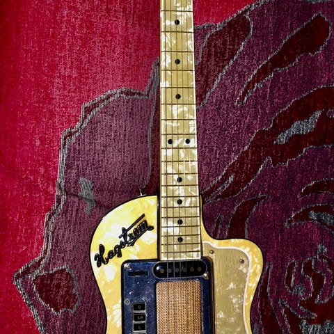 An assembly of non-standard components, ensuring a highly unique sonic output. The central housing is a Le Male perfume tin sourced from a Swedish flea market, affixed to a bamboo neck derived from a consumer-grade cutting board. Fret markers utilize steel rings and repurposed lollipop sticks. An integrated 7.2K Mini Humbucker provides electrical output. Note the deliberate inclusion of an IKEA lamp spring within the neck assembly. Suitable for musicians requiring maximum visual eccentricity.