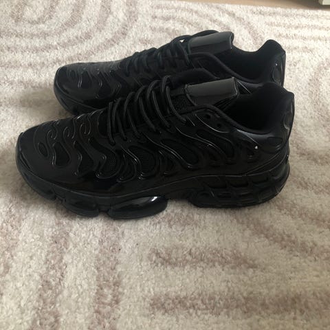 Svarta Nike Air Max sneakers med chunky sula och synliga luftkuddar. Ovandelen är i mesh och syntet med coola detaljer och snörning. Sulan har ett unikt prickigt mönster undertill. Perfekt för dig som gillar sportig och modern stil. De är storlek 42.