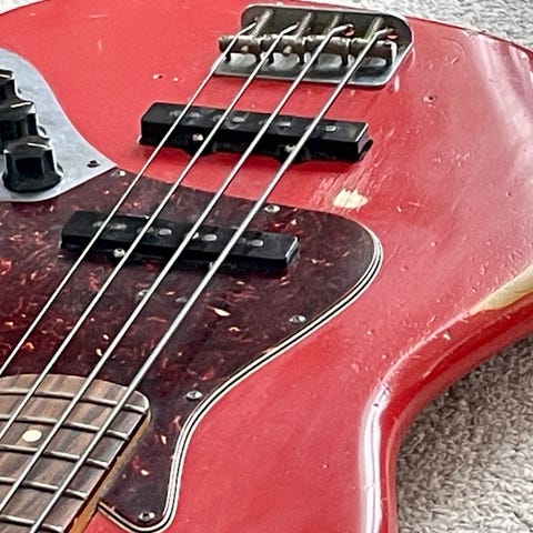 Säljer en riktig snygg och bra vintage Fender Jazzbas från 1976 med greppbräda i lönn med pärlemorinlägg. Basen är original med undantag på mickarna som är Fender Customshop.